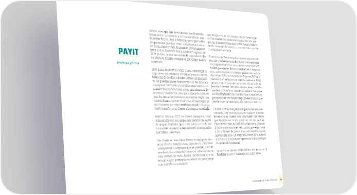 Existe una app que revoluciona las finanzas, Los receptores de la transacción no tienen que desaparece el efectivo y ofrece a cambio una ser forzosamente usuarios de la aplicación, por- solución digital, ágil y sencilla, para que todas que las transacciones se pueden hacer a través las personas puedan tener acceso a su dinero. de un mensaje de texto, correo electrónico o la Se llama Payit y está disponible gratuitamente CLABE interbancaria. para IOS y Android. Todo inició en agosto de PAYIT 2016 gracias a una inversión de capital semilla El servicio de Payit es gratuito para los usuarios. de 350,000 dólares otorgados por Grupo MAPS Revisar el balance de saldo y hacer transacciones www.payit.mx e Investo. con tarjeta de débito o recargas no tiene costo. El modelo para ganar dinero y capitalizar el negocio Hoy, para acceder a Payit, basta descargar la es a través de comisiones por pagos, con tarjeta app, crear un usuario y vincularla a una cuenta de crédito (3 %), con American Express (5.5 %), al bancaria de crédito o débito. Desde ese momen- transferir el saldo a una cuenta bancaria (7.50 to, se pueden hacer transferencias de dinero a pesos) y en el pago de servicios afiliados (9.00 cualquier contacto en el directorio móvil. La pesos). Además, los usuarios de la aplicación plataforma no funciona como una empresa de pueden utilizarla sin estar afiliados a ninguna servicios financieros, sino que resguarda el dinero institución financiera y recibir dinero en efectivo que los usuarios tienen en su cuenta Payit, una por medio de una tarjeta de pago electrónico, que cuenta bancaria intermediaria. Al momento en puede no estar asociada a la banca comercial. que los usuarios requieren hacer uso del efectivo, Payit transfiere ese dinero a la cuenta vinculada. De esta forma, una persona que no estaba ban- carizada, hoy ya acepta pagos digitales y puede Martín Mexía, CEO de Payit, imaginó, creó acceder a su dinero con una tarjeta de débito y desarrolló con su equipo esta plataforma móvil que tramitó en cinco minutos. Al día de hoy, de pagos digitales que, a su juicio, atiende las Payit tiene más de 105,000 usuarios y más de necesidades que ni la banca móvil ni terminales 117,000 transacciones realizadas, que equivalen portátiles resolvían. a 26 millones de pesos transaccionados desde agosto del 2016. La empresa crece 25 % al mes Con Payit se transfiere dinero a cualquier per- y obtiene 2.5 millones de pesos en transacciones sona desde dispositivos móviles y teléfonos en promedio mensual. inteligentes. Los pagos que se pueden realizar van desde servicios del comercio informal, como La meta es alcanzar un millón de usuarios al una lavada de auto, hasta reembolsarle a un finalizar 2018 y 7 millones en cinco años. amigo algún préstamo en efectivo para pagar una cuenta en conjunto. UN CAMINO DE DOBLE SENTIDO 90