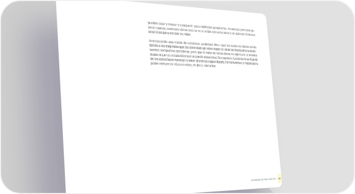 pueden usar y reusar y compartir para múltiples propósitos. Acumular petróleo ge- nera riqueza, acumular datos solo sirve si están estructurados y se aplican técnicas analíticas para extraer su valor. Aventurando una visión de consenso, podemos decir que sin duda los datos están dando a las empresas que los controlan un valor superior al de las hasta ahora domi- nantes compañías petroleras, pero que el valor de estos datos no opera de la misma manera que un commodity que se puede almacenar físicamente. La naturaleza digital de los datos hace necesario tener distintas capacidades, herramientas y reglas para poder extraer de ellos su valor, es decir, minarlos. UN CAMINO DE DOBLE SENTIDO 69