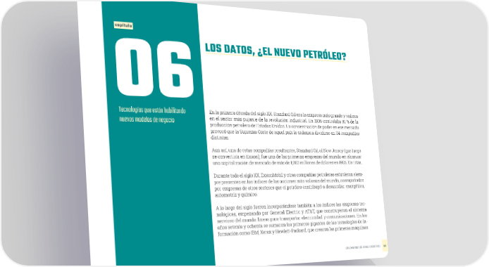 capítulo 06LOS DATOS, ¿EL NUEVO PETRÓLEO? Tecnologías que están habilitando En la primera década del siglo XX, Standard Oil era la empresa más grande y valiosa nuevos modelos de negocio en el sector más pujante de la revolución industrial. En 1906 controlaba 91 % de la producción petrolera de Estados Unidos. La concentración de poder en ese mercado provocó que la Suprema Corte de aquel país le ordenara dividirse en 34 compañías distintas. Aun así, una de estas compañías resultantes, Standard Oil of New Jersey (que luego se convertiría en Exxon), fue una de las primeras empresas del mundo en alcanzar una capitalización de mercado de más de 1,000 millones de dólares en 1925. Un titán. Durante todo el siglo XX, ExxonMobil y otras compañías petroleras estuvieron siem- pre presentes en los índices de las acciones más valiosas del mundo, acompañadas por empresas de otros sectores que el petróleo contribuyó a desarrollar: energético, automotriz y químico. A lo largo del siglo fueron incorporándose también a los índices las empresas tec- nológicas, empezando por General Electric y AT&T, que construyeron el sistema nervioso del mundo: líneas para transportar electricidad y comunicaciones. En los años setenta y ochenta se sumaron los primeros gigantes de las tecnologías de in- formación como IBM, Xerox y Hewlett-Packard, que crearon las primeras máquinas UN CAMINO DE DOBLE SENTIDO 67