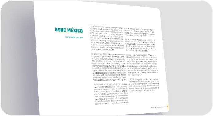 La efervescencia del ecosistema emprendedor misma forma; además, definir en qué estable- en México, uno de los setenta países donde tra- cimientos pueden ser usadas, incluso en qué HSBC MÉXICO baja la marca, capturó la visión de directivos de ubicación geográfica, lo cual proporciona a sus HSBC y los llevó a tender el puente innovador clientes total control y seguridad. al sumarse a Startupbootcamp FinTech, la red www.hsbc.com.mx global de aceleradoras que, en colaboración con Esto nos muestra que la forma de colaboración Finnovista, lanzó su primer programa de acele- ha sido sumando a las FinTechs como socias ración en América Latina a principios de 2017, tecnológicas de HSBC México, donde la aporta- y luego un programa de escalamiento a finales ción de cada uno de los participantes da valor de ese mismo año. Ambos programas tienen a la ecuación de atender con mayor eficacia, como base la Ciudad de México. flexibilidad y seguridad al cliente. La inmersión de HSBC México en ese ambiente Ser socio o proveedor tecnológico de las institu- emprendedor que privilegia la tecnología finan- ciones financieras es el esquema más recurrente ciera, lo llevó a mirarse a sí mismo y darse cuenta en la era de la transformación digital. Si el de la necesidad de renovarse digitalmente. Así, modelo de negocio de una empresa FinTech es HSBC México entabló un partnership formal de consumo masivo o si busca captar recursos, con Startupbootcamp FinTech, por ser la única necesariamente requiere de la colaboración aceleradora cien por ciento dedicada al tema. de un banco o una institución que les permita Su participación fue activa, formando parte en realizar estas funciones, lo que abre la discusión la definición misma de temáticas consideradas del esquema Open Banking, donde todavía no relevantes desde el punto de selección de startups, hay reglas completas. tales como iniciativas relacionadas con biomé- tricos, IA o machine learning, por decir algunos. HSBC México apuesta a colaborar con empresas FinTech a modo de aliados tecnológicos, en vez Previamente, la institución financiera entabló de crear programas propios. Actualmente está una relación con una empresa que en cinco años en la fase de establecer programas piloto con evolucionó hasta convertirse en un proveedor algunas startups de la primera generación de tecnológico del sector. El beneficio se concretó Startupbootcamp FinTech Mexico City. con el producto HSBC Control Total, lanzado en 2017: una aplicación que permite controlar de forma total las tarjetas de crédito y débito de los clientes del banco con un solo botón, deshabilitar su uso sin cancelarla y volverla a habilitar de la UN CAMINO DE DOBLE SENTIDO 89