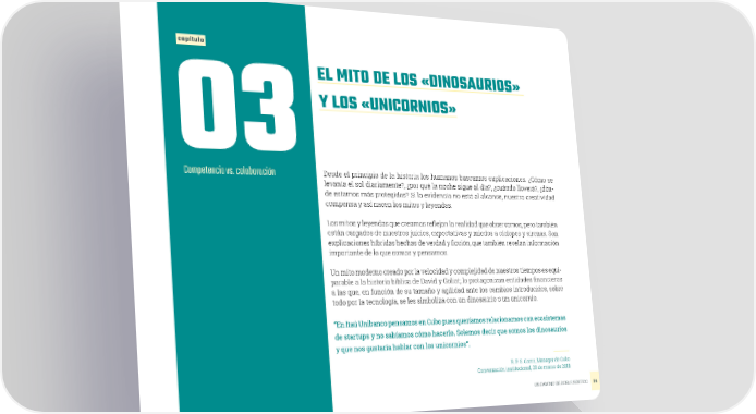 capítulo EL MITO DE LOS «DINOSAURIOS» 03Y LOS «UNICORNIOS» Competencia vs. colaboración Desde el principio de la historia los humanos buscamos explicaciones. ¿Cómo se levanta el sol diariamente?, ¿por qué la noche sigue al día?, ¿cuándo lloverá?, ¿dón- de estamos más protegidos? Si la evidencia no está al alcance, nuestra creatividad compensa y así nacen los mitos y leyendas. Los mitos y leyendas que creamos reflejan la realidad que observamos, pero también están cargados de nuestros juicios, expectativas y miedos a cíclopes y sirenas. Son explicaciones híbridas hechas de verdad y ficción, que también revelan información importante de lo que somos y pensamos. Un mito moderno creado por la velocidad y complejidad de nuestros tiempos es equi- parable a la historia bíblica de David y Goliat; lo protagonizan entidades financieras a las que, en función de su tamaño y agilidad ante los cambios introducidos, sobre todo por la tecnología, se les simboliza con un dinosaurio o un unicornio. “En Itaú Unibanco pensamos en Cubo pues queríamos relacionarnos con ecosistemas de startups y no sabíamos cómo hacerlo. Solemos decir que somos los dinosaurios y que nos gustaría hablar con los unicornios”. R. P. S. Gama, Manager de Cubo Conversación institucional, 28 de marzo de 2018 UN CAMINO DE DOBLE SENTIDO 34