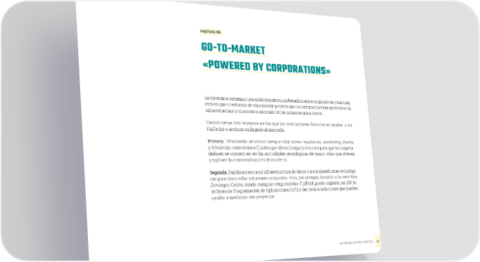 capítulo 04 GO-TO-MARKET «POWERED BY CORPORATIONS» La clave para conseguir una simbiosis de mutuo beneficio entre corporativos y startups, está en que el vehículo de vinculación permita que las últimas puedan aprovechar la infraestructura y el acceso a mercado de las primeras para crecer. Encontramos tres maneras en las que las instituciones financieras ayudan a las FinTechs a acelerar su llegada al mercado. Primera. Ofreciendo servicios compartidos como regulación, marketing, diseño y desarrollo, como lo hace Fiinlab, que libera tiempo y recursos para que los empren- dedores se concentren en las actividades tecnológicas de mayor valor que ofrecen y agilicen la comercialización de su oferta. Segunda. Dando acceso a su infraestructura de datos o a sus plataformas tecnológi- cas para desarrollar soluciones conjuntas. Visa, por ejemplo, lanzó el sitio web Visa Developer Center, donde cualquier emprendedor FinTech puede explorar las 200 In- terfaces de Programación de Aplicaciones (API) y las treinta soluciones que pueden ayudar a apalancar sus proyectos. UN CAMINO DE DOBLE SENTIDO 54