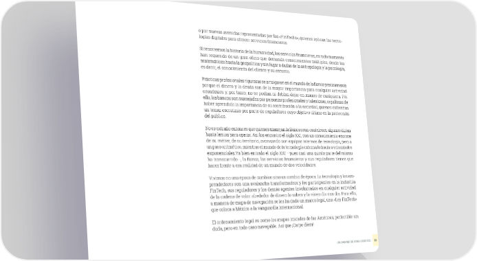o por nuevas avenidas representadas por las «FinTechs», quienes aplican las tecno- logías digitales para ofrecer servicios financieros. Si recorremos la historia de la humanidad, los servicios financieros, en todo momento han requerido de un gran oficio que demanda conocimientos múltiples, desde las matemáticas hasta la geopolítica y sin lugar a dudas de la antropología y la psicología, es decir, el conocimiento del cliente y su entorno. Prácticas profesionales rigurosas se arraigaron en el mundo de la Banca precisamente porque el dinero y la deuda son de la mayor importancia para cualquier actividad económica y, por tanto, no se podían ni debían dejar en manos de cualquiera. Por ello, los bancos son manejados por personas profesionales y talentosas, orgullosas de haber aprendido la importancia de su contribución a la sociedad, quienes enfrentan un tenaz escrutinio por parte de reguladores cuyo objetivo último es la protección del público. No es extraño entonces que quienes manejan la Banca sean cautelosos, algunos dirían hasta lentos para operar. Así los encontró el siglo XXI, con un conocimiento enorme de su métier, de su territorio, avanzando con equipos internos de tecnología, pero a un paso aritmético, mientras el mundo de la tecnología externa lo hacía a velocidades exponenciales.Ya bien entrado el siglo XXI —pues casi una quinta parte del mismo ha transcurrido—, la Banca, los servicios financieros y sus reguladores tienen que hacer frente a esa realidad de un mundo de dos velocidades. Vivimos no una época de cambios sino un cambio de época. La tecnología y los em- prendedores son una avalancha transformadora y los participantes en la industria FinTech, sus reguladores y los demás agentes involucrados en cualquier actividad de la cadena de valor alrededor de dinero lo saben y lo viven día con día. Para ello, a manera de mapa de navegación se les ha dado un marco legal, una «Ley FinTech» que coloca a México a la vanguardia internacional. El ordenamiento legal es como los mapas iniciales de las Américas, perfectible sin duda, pero en todo caso navegable. Así que ¡Carpe diem! UN CAMINO DE DOBLE SENTIDO 22