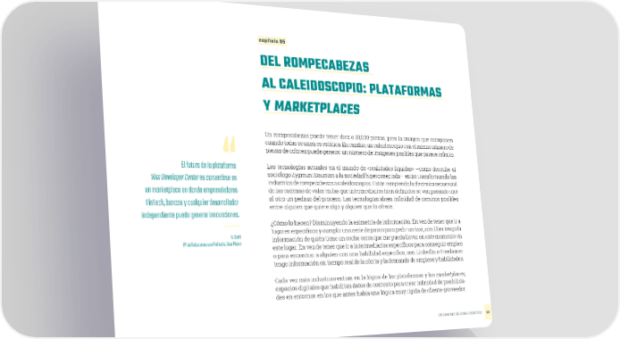 capítulo 05 DEL ROMPECABEZAS AL CALEIDOSCOPIO: PLATAFORMAS Y MARKETPLACES Un rompecabezas puede tener diez o 10,000 piezas, pero la imagen que componen cuando todas se unen es estática. En cambio, un caleidoscopio con el mismo número de piezas de colores puede generar un número de imágenes posibles que parece infinito. El futuro de la plataforma Las tecnologías actuales en el mundo de «realidades líquidas» —como describe el Visa Developer Center es convertirse en sociólogo Zygmunt Bauman a la sociedad hiperconectada— están transformando las industrias de rompecabezas a caleidoscopios. Están rompiendo la dinámica secuencial un marketplace en donde emprendedores de las cadenas de valor en las que intermediarios bien definidos se van pasando uno FinTech, bancos y cualquier desarrollador al otro un pedazo del proceso. Las tecnologías abren infinidad de caminos posibles entre alguien que quiere algo y alguien que lo ofrece. independiente pueda generar innovaciones. ¿Cómo lo hacen? Disminuyendo la asimetría de información. En vez de tener que ir a A. Cueli lugares específicos y cumplir una serie de pasos para pedir un taxi, con Uber tengo la VP de Relaciones con FinTechs, Visa Miami información de quién tiene un coche cerca que me pueda llevar en este momento en este lugar. En vez de tener que ir a intermediarios específicos para conseguir empleo o para encontrar a alguien con una habilidad específica, con LinkedIn o Freelancer tengo información en tiempo real de la oferta y la demanda de empleos y habilidades. Cada vez más industrias entran en la lógica de las plataformas y los marketplaces; espacios digitales que habilitan datos de contexto para crear infinidad de posibilida- des en entornos en los que antes había una lógica muy rígida de cliente-proveedor. UN CAMINO DE DOBLE SENTIDO 60