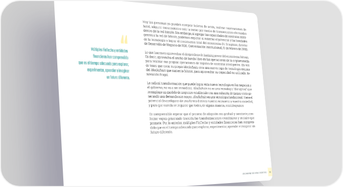Hoy las personas ya pueden comprar boletos de avión, realizar reservaciones de hotel, adquirir excursiones o salir a comer por medio de transacciones efectuadas dentro de la red bitcoin. Sin embargo, al agregar las capacidades de contratos inteli- gentes a la red de bitcoin, podemos explotar al máximo el potencial y las bondades de la tecnología y lograr el crecimiento total del ecosistema (H. Sraigman, director de Desarrollo de Negocio de RSK. Conversación institucional, 15 de febrero de 2018). Lo que hacen es aprovechar el desperdicio de Múltiples FinTechs y entidades hashing power del ecosistema bitcoin. financieras han comprendido Es decir, aprovecha el ancho de banda libre en las operaciones de la criptomoneda para realizar sus propias operaciones de registro de contratos inteligentes. En vez que es el tiempo adecuado para explorar, de tener que crear su propio blockchain, crea una nueva capa de tecnología encima experimentar, aprender e imaginar del blockchain que sustenta bitcoin, para aprovechar su capacidad no utilizada. In- novación frugal. un futuro diferente. La radical transformación que puede lograr esta nueva tecnología en los negocios y el gobierno, no va a ser inmediata. Blockchain no es una tecnología “disruptiva” que reemplaza un modelo de negocios establecido con una solución de menor costo ge- nerando una demanda aún mayor. Blockchain es una tecnología fundacional. Tiene el potencial de configurar de una forma distinta nuestra economía y nuestra sociedad, y para que suceda se requiere que todos, de alguna manera, contribuyamos. Es comprensible esperar que el proceso de adopción sea gradual y constante, con- forme vayan generando tracción las transformaciones económicas y sociales que promete. Por lo anterior, múltiples FinTechs y entidades financieras han compren- dido que es el tiempo adecuado para explorar, experimentar, aprender e imaginar un futuro diferente. UN CAMINO DE DOBLE SENTIDO 77