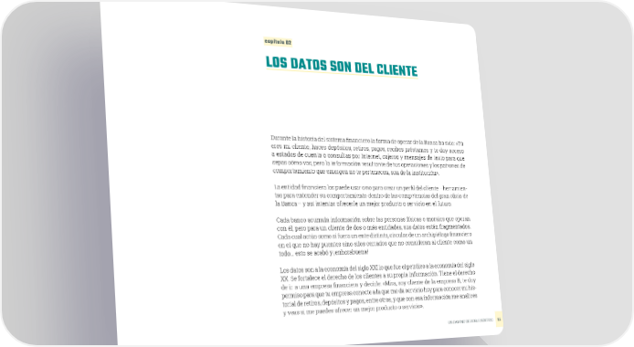capítulo 02 LOS DATOS SON DEL CLIENTE Durante la historia del sistema financiero la forma de operar de la Banca ha sido: «Tú eres mi cliente, haces depósitos, retiros, pagos, recibes préstamos y te doy acceso a estados de cuenta o consultas por Internet, cajeros y mensajes de texto para que sepas cómo vas, pero la información resultante de tus operaciones y los patrones de comportamiento que emergen no te pertenecen, son de la institución». La entidad financiera los puede usar o no para crear un perfil del cliente —herramien- tas para entender su comportamiento dentro de las competencias del gran oficio de la Banca— y así intentar ofrecerle un mejor producto o servicio en el futuro. Cada banco acumula información sobre las personas físicas o morales que operan con él, pero para un cliente de dos o más entidades, sus datos están fragmentados. Cada cual actúa como si fuera un ente distinto, círculos de un archipiélago financiero en el que no hay puentes sino silos cerrados que no consideran al cliente como un todo... esto se acabó y ¡enhorabuena! Los datos son a la economía del siglo XXI lo que fue el petróleo a la economía del siglo XX. Se fortalece el derecho de los clientes a su propia información. Tiene el derecho de ir a una empresa financiera y decirle: «Mira, soy cliente de la empresa B, te doy permiso para que tu empresa conecte a la que me da servicio hoy para conocer mi his- torial de retiros, depósitos y pagos, entre otros, y que con esa información me analices y veas si me puedes ofrecer un mejor producto o servicio». UN CAMINO DE DOBLE SENTIDO 25
