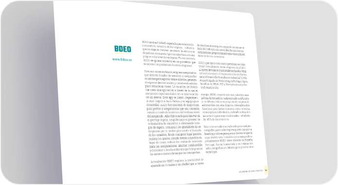 BDEO es una FinTech española que está revolu- de machine learning, sea capaz de reconocer el cionando la industria de los seguros... industria daño del vehículo sin necesidad de una interac- BDEO que no deja de innovar, ya sea en la estructura ción humana, proporcionando una valuación del de pólizas, en nuevos tipos de cobertura o en sus daño de forma inmediata. propias soluciones tecnológicas. En ese contexto, www.bdeo.es BDEO se quiere convertir en un proveedor que BDEO, que inició con cuatro personas, se cons- solucione los problemas de estas empresas. tituyó formalmente como empresa en el 2017. El apoyo de bancos y aceleradoras ha sido vital, Tuvo sus raíces en Noaris, empresa aseguradora así como también el financiamiento del Centro que detectó fraudes de asesores y asegurados para el Desarrollo Tecnológico Industrial (CDTI). coludidos para reportar daños inflados, generan- Ha participado en Protechting en Portugal, Open do egresos desmesurados y cometiendo estafas Sandbox de BBVA, F10 y Startupbootcamp Fin- para remodelar casas. La solución de Noaris Tech Mexico City. fue crear una aplicación a través de la cual el asegurado reportara daños sin la intervención Aunque BDEO empezó con una solución para de un asesor. Esta app se llamó «Reparanet», pólizas de inmuebles, cada mercado es diferente la cual inspiró a Julio Pernía y su equipo para y en México lidera un proyecto de seguros de desarrollar BDEO: herramienta de inspección automóviles con Ana Seguros. Esta aplicación para peritos y aseguradoras que usa conexión funciona para daños menores como cristales remota a través de la cámara del teléfono móvil rotos y golpes individuales, en donde no hay otro del asegurado. Julio dejó Noaris para innovar en automóvil o personas involucradas —alrededor el peritaje digital, simplificando el proceso de del 45 % de los siniestros. reclamación de siniestros y eliminando tiem- pos de espera. Con BDEO los ajustadores no se Este mismo modelo es replicable para cualquier desplazan por la ciudad para asistir el llamado compañía, pues cada empresa puede agregar su de los usuarios; desde cualquier lugar pueden branding y colores para que sus clientes tengan la realizar los ajustes, atender treinta siniestros en seguridad de estar tratando con su aseguradora. lugar de cinco, reducir los costos de inversión Actualmente BDEO tiene clientes en España, para las aseguradoras, ahorrar combustible Portugal, Suiza, Guatemala y ya trabaja con y disminuir la huella ambiental que hoy generan ocho compañías en México para pilotear esta los autos o motocicletas que los transportan. tecnología. Actualmente BDEO explora la posibilidad de ajustadores virtuales y un chatbot que, a través UN CAMINO DE DOBLE SENTIDO 84