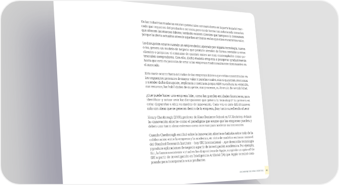 En las industrias maduras existen potenciales consumidores en la parte baja del mer- cado que requieren del producto o servicio, pero no de forma tan sofisticada como los que ofrecen las marcas líderes; también existen clientes que tampoco lo consumen porque la oferta actual no atiende aquellos atributos en los que ellos encuentran valor. La disrupción ocurre cuando un emprendedor, apoyado por alguna tecnología, nueva o no, genera un modelo de negocio que permite atender de forma rentable a estos clientes o propiciar el consumo de quienes antes no eran contemplados como po- tenciales compradores. Con ello, dicho modelo empieza a prosperar gradualmente hasta que está en posición de retar a las empresas tradicionalmente dominantes en el mercado. Esto suele ocurrir fuera del radar de las empresas líderes que están concentradas en los segmentos presentes de mayor valor y para las cuales, aún si quisieran reaccionar y atender dicha disrupción, implicaría ir contra su propio ADN: su cultura, su vocación, sus recursos, las habilidades de su gente, sus procesos, su fórmula de rentabilidad. ¿Qué puede hacer una empresa líder, como las grandes entidades financieras, para identificar y actuar ante las disrupciones que genera la tecnología? Lo primero es estar dispuestas a abrir su modelo de innovación. Cada vez es más difícil innovar solo con ideas que se generan dentro de la empresa, ¡hay tanto sucediendo afuera! Henry Chesbrough (2003), profesor de Haas Business School en UC Berkeley, definió la «innovación abierta» como el paradigma que asume que las empresas pueden y deben usar tanto ideas externas como internas para acelerar su innovación. Cuando Chesbrough escribió sobre la innovación abierta se hablaba sobre todo de la colaboración entre la empresa y la academia, en vista de modelos exitosos como el del Stanford Research Institute —hoy SRI International—, que desarrolla tecnología y produce aplicaciones de negocio a partir de investigación académica. Por ejemplo, Siri, la famosa asistente virtual en los dispositivos de Apple, surgió de un spin-off de SRI a partir de investigación en Inteligencia Artificial (IA) que Apple terminó com- prando para incorporarla a sus productos. UN CAMINO DE DOBLE SENTIDO 47