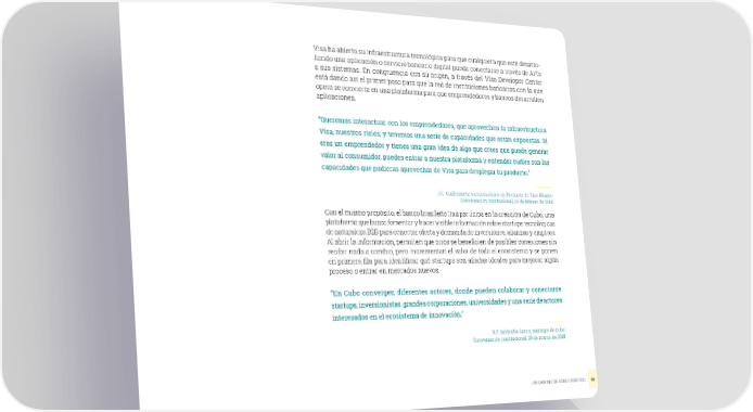 Visa ha abierto su infraestructura tecnológica para que cualquiera que esté desarro- llando una aplicación o servicio bancario digital pueda conectarse a través de APIs a sus sistemas. En congruencia con su origen, a través del Visa Developer Center está dando así el primer paso para que la red de instituciones bancarias con la que opera se convierta en una plataforma para que emprendedores y bancos desarrollen aplicaciones. “Queremos interactuar con los emprendedores, que aprovechen la infraestructura Visa, nuestros rieles, y tenemos una serie de capacidades que están expuestas. Si eres un emprendedor y tienes una gran idea de algo que crees que puede generar valor al consumidor, puedes entrar a nuestra plataforma y entender cuáles son las capacidades que pudieras aprovechar de Visa para desplegar tu producto.” J.C. Guillermety, vicepresidente de Producto de Visa México Conversación institucional, 26 de febrero de 2018 Con el mismo propósito, el banco brasileño Itaú participa en la creación de Cubo, una plataforma que busca fomentar y hacer visible información sobre startups tecnológicas de naturaleza B2B para conectar oferta y demanda de inversiones, alianzas y empleos. Al abrir la información, permiten que otros se beneficien de posibles conexiones sin recibir nada a cambio, pero incrementan el valor de todo el ecosistema y se ponen en primera fila para identificar qué startups son aliadas ideales para mejorar algún proceso o entrar en mercados nuevos. “En Cubo convergen diferentes actores, donde pueden colaborar y conectarse startups, inversionistas, grandes corporaciones, universidades y una serie de actores interesados en el ecosistema de innovación.” R.P. Saldanha Gama, manager de Cubo Conversación institucional, 28 de marzo de 2018 UN CAMINO DE DOBLE SENTIDO 61