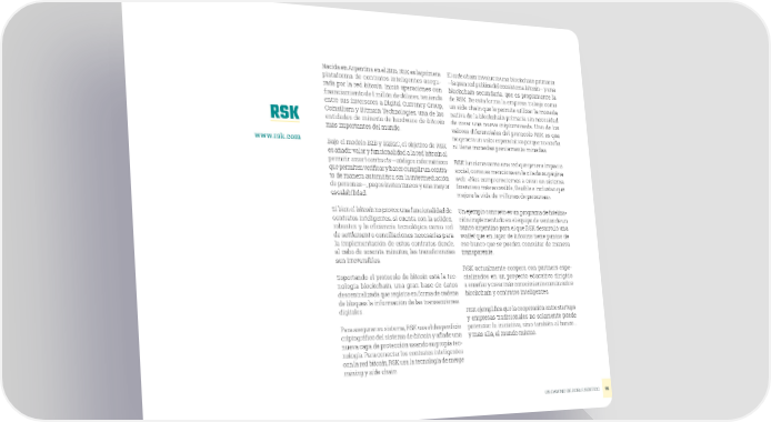 Nacida en Argentina en el 2016, RSK es la primera El side chain involucra una blockchain primaria plataforma de contratos inteligentes asegu- —la gran red pública del ecosistema bitcoin— y una rada por la red bitcoin. Inició operaciones con blockchain secundaria, que es propiamente la financiamiento de 1 millón de dólares, teniendo de RSK. De esta forma la empresa trabaja como entre sus inversores a Digital Currency Group, un side chain que le permite utilizar la moneda Coinsilium y Bitmain Technologies, una de las nativa de la blockchain primaria sin necesidad RSK entidades de minería de hardware de bitcoin de crear una nueva criptomoneda. Uno de los más importantes del mundo. valores diferenciales del protocolo RSK es que www.rsk.com no genera un valor especulativo porque no acuña Bajo el modelo B2B y B2B2C, el objetivo de RSK ni tiene monedas previamente minadas. es añadir valor y funcionalidad a la red bitcoin al permitir smart contracts —códigos informáticos RSK funciona como una red que genera impacto que permiten verificar y hacer cumplir un contra- social, como se menciona en la cita de su página to de manera automática sin la intermediación web: «Nos comprometemos a crear un sistema de personas—, pagos instantáneos y una mayor financiero más accesible, flexible e inclusivo que escalabilidad. mejore la vida de millones de personas». Si bien el bitcoin no provee una funcionalidad de Un ejemplo concreto es un programa de fideliza- contratos inteligentes, sí cuenta con la solidez, ción implementado en el equipo de ventas de un robustez y la eficiencia tecnológica como red banco argentino para el que RSK desarrolló una de settlement o conciliaciones necesarias para wallet que en lugar de bitcoins tiene puntos de la implementación de estos contratos donde, ese banco que se pueden consultar de manera al cabo de sesenta minutos, las transferencias transparente. son irreversibles. RSK actualmente coopera con partners espe- Soportando el protocolo de bitcoin está la tec- cializados en un proyecto educativo dirigido nología blockchain, una gran base de datos a enseñar y crear más conocimiento común sobre descentralizada que registra en forma de cadena blockchain y contratos inteligentes. de bloques la información de las transacciones digitales. RSK ejemplifica que la cooperación entre startups y empresas tradicionales no solamente puede Para asegurar su sistema, RSK usa el desperdicio potenciar la iniciativa, sino también al banco... criptográfico del sistema de bitcoin y añade una y más allá, al mundo mismo. nueva capa de protección usando su propia tec- nología. Para conectar los contratos inteligentes con la red bitcoin, RSK usa la tecnología de merge mining y side chain. UN CAMINO DE DOBLE SENTIDO 91