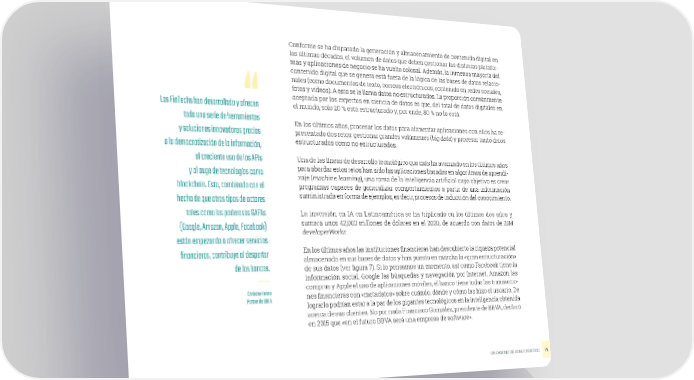 Conforme se ha disparado la generación y almacenamiento de contenido digital en las últimas décadas, el volumen de datos que deben gestionar las distintas platafor- mas y aplicaciones de negocio se ha vuelto colosal. Además, la inmensa mayoría del contenido digital que se genera está fuera de la lógica de las bases de datos relacio- nales (como documentos de texto, correos electrónicos, contenido en redes sociales, fotos y videos). A esto se le llama datos no estructurados. La proporción comúnmente aceptada por los expertos en ciencia de datos es que, del total de datos digitales en Las FinTechs han desarrollado y ofrecen el mundo, solo 20 % está estructurado y, por ende, 80 % no lo está. toda una serie de herramientas En los últimos años, procesar los datos para alimentar aplicaciones con ellos ha re- y soluciones innovadoras gracias presentado dos retos: gestionar grandes volúmenes (big data) y procesar tanto datos a la democratización de la información, estructurados como no estructurados. al creciente uso de los APIs Una de las líneas de desarrollo tecnológico que más ha avanzado en los últimos años y al auge de tecnologías como para abordar estos retos han sido las aplicaciones basadas en algoritmos de aprendi- zaje (machine learning), una rama de la inteligencia artificial cuyo objetivo es crear blockchain. Esto, combinado con el programas capaces de generalizar comportamientos a partir de una información hecho de que otros tipos de actores suministrada en forma de ejemplos, es decir, procesos de inducción del conocimiento. tales como las poderosas GAFAs La inversión en IA en Latinoamérica se ha triplicado en los últimos dos años y (Google, Amazon, Apple, Facebook) sumará unos 42,000 millones de dólares en el 2020, de acuerdo con datos de IBM developerWorks. están empezando a ofrecer servicios financieros, contribuye al despertar En los últimos años las instituciones financieras han descubierto la riqueza potencial almacenada en sus bases de datos y han puesto en marcha la «gran estructuración» de los bancos. de sus datos (ver figura 7). Si lo pensamos un momento, así como Facebook tiene la información social, Google las búsquedas y navegación por Internet, Amazon las Christine Kenna compras y Apple el uso de aplicaciones móviles, el banco tiene todas las transaccio- Partner de IGNIA nes financieras con «metadatos» sobre cuándo, dónde y cómo las hizo el usuario. De lograrlo podrían estar a la par de los gigantes tecnológicos en la inteligencia obtenida acerca de sus clientes. No por nada Francisco González, presidente de BBVA, declaró en 2015 que «en el futuro BBVA será una empresa de software». UN CAMINO DE DOBLE SENTIDO 71