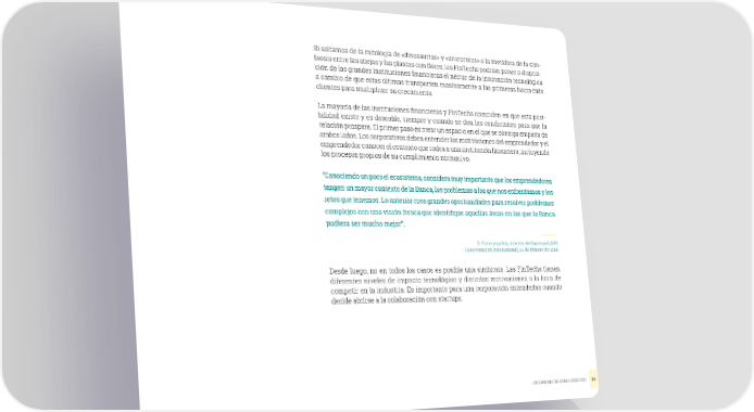 Si saltamos de la mitología de «dinosaurios» y «unicornios» a la metáfora de la sim- biosis entre las abejas y las plantas con flores, las FinTechs podrían poner a disposi- ción de las grandes instituciones financieras el néctar de la innovación tecnológica a cambio de que estas últimas transporten masivamente a las primeras hacia más clientes para multiplicar su crecimiento. La mayoría de las instituciones financieras y FinTechs coinciden en que esta posi- bilidad existe y es deseable, siempre y cuando se den las condiciones para que la relación prospere. El primer paso es crear un espacio en el que se consiga empatía de ambos lados. Los corporativos deben entender las motivaciones del emprendedor y el emprendedor conocer el contexto que rodea a una institución financiera, incluyendo los procesos propios de su cumplimiento normativo. “Conociendo un poco el ecosistema, considero muy importante que los emprendedores tengan un mayor contexto de la Banca, los problemas a los que nos enfrentamos y los retos que tenemos. Lo anterior crea grandes oportunidades para resolver problemas complejos con una visión fresca que identifique aquellas áreas en las que la Banca pudiera ser mucho mejor”. D. Strimpopulos, director de BanregioLABS Conversación institucional, 26 de febrero de 2018 Desde luego, no en todos los casos es posible una simbiosis. Las FinTechs tienen diferentes niveles de impacto tecnológico y distintas motivaciones a la hora de competir en la industria. Es importante para una corporación entenderlas cuando decide abrirse a la colaboración con startups. UN CAMINO DE DOBLE SENTIDO 39