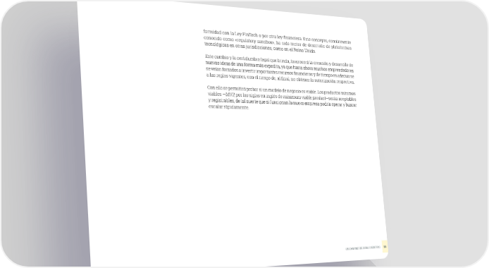 formidad con la Ley FinTech o por otra ley financiera. Este concepto, comúnmente conocido como «regulatory sandbox», ha sido motor de desarrollo de plataformas tecnológicas en otras jurisdicciones, como en el Reino Unido. Este cambio y la certidumbre legal que brinda, favorecerá la creación y desarrollo de nuevas ideas de una forma más expedita, ya que hasta ahora muchos emprendedores se veían forzados a invertir importantes recursos financieros y de tiempo en adecuarse a las reglas vigentes, con el riesgo de, al final, no obtener la autorización respectiva. Con ello se permitirá probar si un modelo de negocio es viable. Los productos mínimos viables —MVP, por las siglas en inglés de minimum viable product—serán aceptables y registrables, de tal suerte que si funcionan la nueva empresa podría operar y buscar escalar rápidamente. UN CAMINO DE DOBLE SENTIDO 28